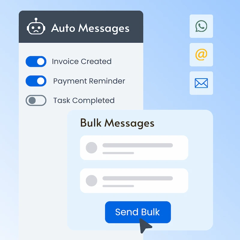 Automate reminders and send bulk WhatsApp, Email, or SMS notifications for tasks, due dates, documents, payments, or any custom update you need.