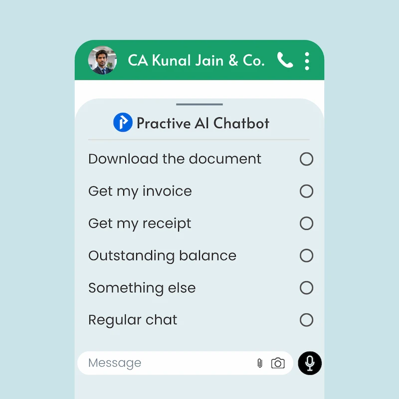 Your WhatsApp number becomes smarter with AI. Clients can chat to check task status, download documents and invoices, and more. No manual replies needed.