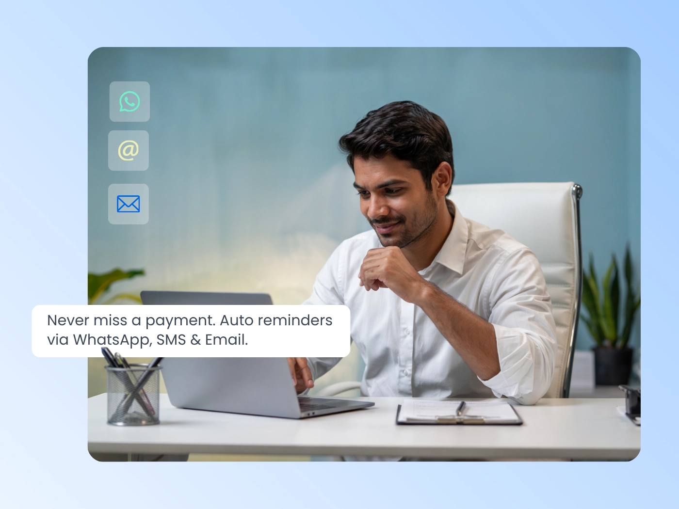 By sending payment reminders, you can proactively remind your clients or customers of their payment obligations and provide them with an easy and convenient way to pay. You can send payment reminders via WhatsApp, text message and email or payment link, and can be personalized to include information about the payment amount, due date, and payment options.